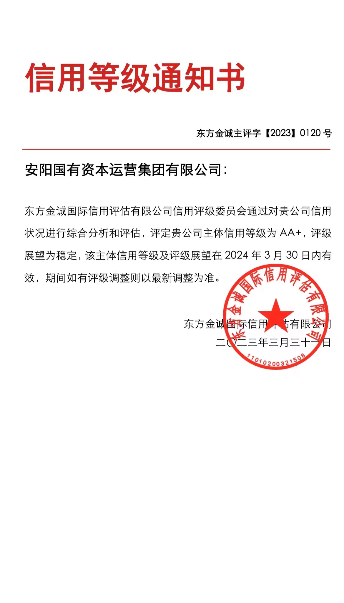 2023年4月7日,經(jīng)國內(nèi)權(quán)威信用評級機(jī)構(gòu)——東方金誠國際信用評估有限公司出具正式報告,評定安陽國有資本運(yùn)營集團(tuán)有限公司(下稱安陽國資集團(tuán))主體信用等級為“AA+”,評級展望為“穩(wěn)定”,安陽國資集團(tuán)成為我市首家主體信用為“AA+”的企業(yè),實(shí)現(xiàn)了我市國有企業(yè)增信提級的重大突破。