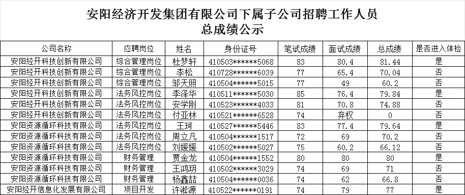 根據(jù)《安陽(yáng)經(jīng)濟(jì)開(kāi)發(fā)集團(tuán)有限公司下屬子公司工作人員招聘公告》的考試規(guī)則,現(xiàn)將綜合成績(jī)公示。請(qǐng)進(jìn)入體檢人員保持電話暢通。